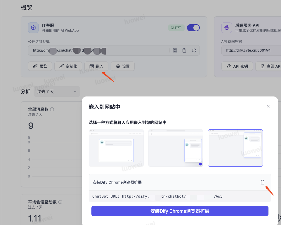 | - 创建Dify应用配置,在应用概览中点击嵌入,切换到安装Chrome浏览器扩展视图,点击copy按钮获取ChatBot Url,如图: | |||